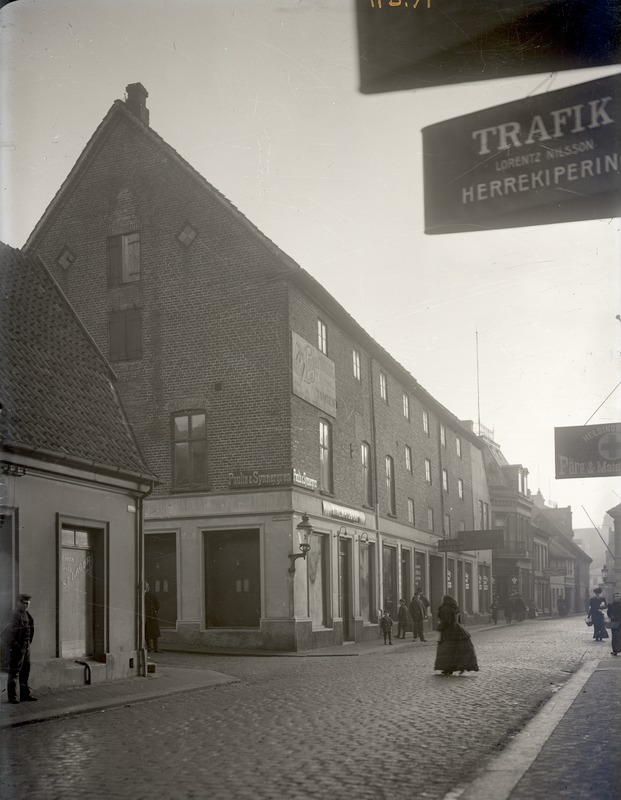 Fotografi av korsningen Kullagatan - Långvinkelsgatan. Gatan kantas av olika typer av butiker och ett flertal reklamskyltar syns på fasaderna. Längs med gatan syns män, kvinnor och barn.