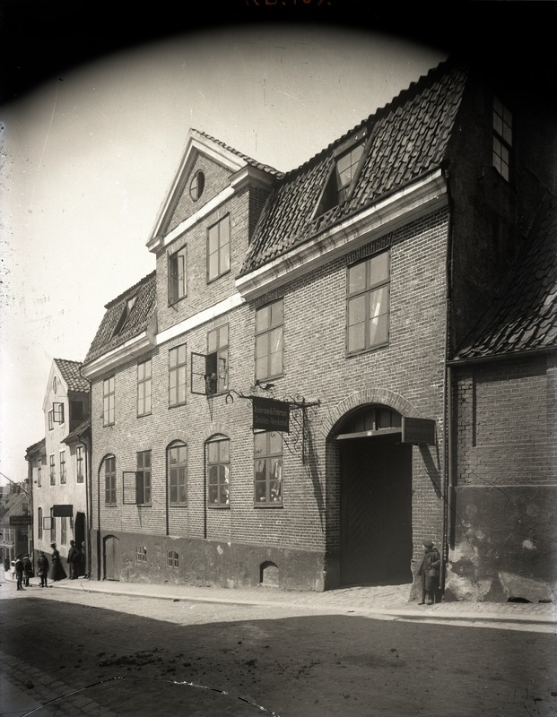 Fotografi som visar delar av Långvinkelsgatan. Fotografiet är taget åt nordväst. Till höger i bild står en pojke intill husväggen. Till vänster om honom en port som är öppen. På varsin sida om porten hänger två skyltar. På den ena står det "Andersson & Petersson. Smides-Verkstad." och på en andra "C.J.Olsson Brandmästare". Två flickor tittar ut mot fotografen i ett av fönsterna på andra våningen. Vid nästa hus, till vänster i bild, står ett antal barn utanför porten. En man och ytterligare en person står i själva porten och en kvinna är på väg därifrån. Skylten ovanför går ej att läsa. Från nästa hus, som ej syns på grund av vinkeln, sticker en annan skylt fram där det står "Nordensson & Sonesson Piano-fabrik".