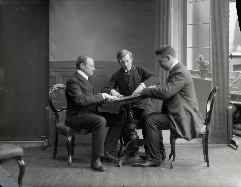 Gruppbild. Från vänster redaktör Hjalmar Jönsson, antispiritisten Faustinus, redaktör Georg Blomstedt. Bordsdansmysterier.