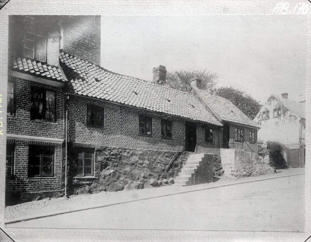 Avfotograferat fotografi av Långvinkelsgatan. Möjligen är det Alfred B. Nilson som själv fotograferat originalet. Till vänster i bild syns en del av ett flervåningshus i tegel. Ihopbyggt med det, åt höger, ligger två enplans- eller 1,5-planshus. Dessa är upphöjda på höga stengrunder med trappor som leder upp till huvudingångarna. Bakom dessa skymtar en betydligt högre tegelbyggnad samt några träd. Längst till höger i bild syns gaveln på nästa hus.