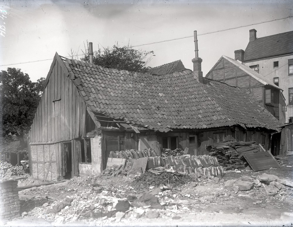 Fotografi av Carlsgatan under arbete 1904. I förgrunden en innergård med rester av husrivning i form av virke och tegelpannor. Mitt i bild ett fallfärdigt enplanshus. I bakgrunden flervåningshus.