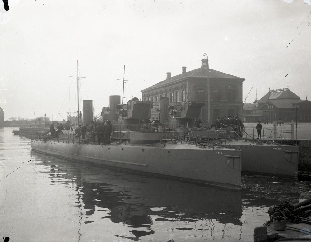 Krigsfartygen "Thetis" och "Iris" vid mellersta hamnens norra kaj.