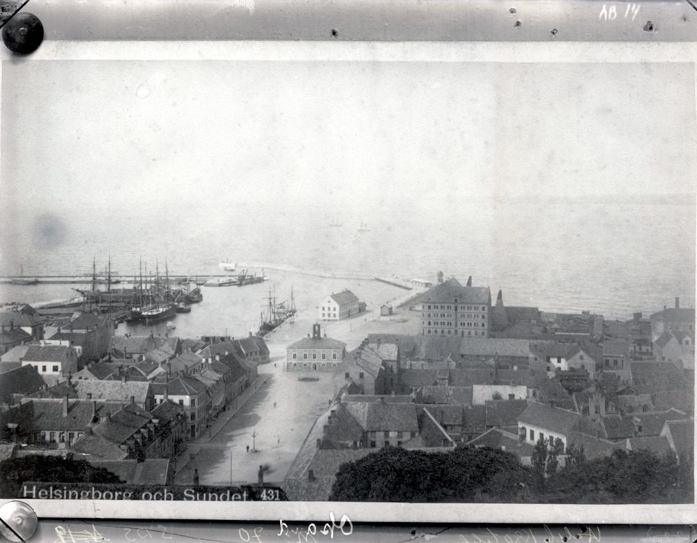 Avfotograferad påsiktsbild. Originalfotografiet är troligen från 1880-talet, fotografen är dock okänd. Fotografiet visar delar av Helsingborgs centrum med stortorget i mitten av bilden. Bilden är troligen tagen någonstans uppifrån Landborgen. Gamla Rådhuset och Gamla Tullhuset samt hamnen, med ett antal fartyg, är synliga. Ute på sundet syns ett par fartyg svagt men Danmark är inte synligt. Ett antal saker finns skrivna på bilden men det mesta av detta är otydligt, förutom "1880-talet".