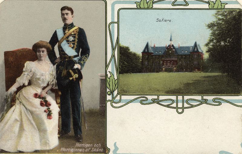 Två olika kolorerade foton av Sofiero slott och Gustav VI Adolf och Margareta. På kortet står: "Sofiero" samt "Hertigen och Hertiginnan af Skåne".