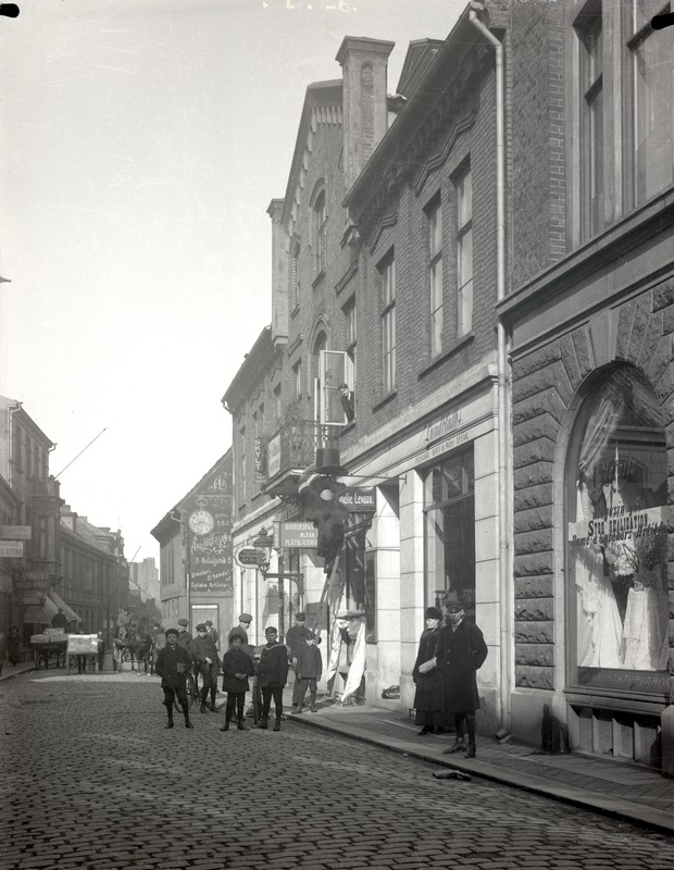 Fotografi av Kullagatan. Till höger syns skyltfönstret till butiken Victoria, en dam- och sybehörsbutik. Vägg i vägg ligger Lundbladhs hatt- och mössaffär. Därefter syns skyltar till ytterligare ett antal verksamheter, bland annat Amelie Leveaus butik och Bröderna Bleck Plåtslageri. På trottoaren framför Lundbladhs står en man som tittar in i kameran. Snett bakom honom står en kvinna i päls och pälsmössa. Vid nästa skyltfönster står en man på en stege. Ovanför honom lutar sig en man ut genom ett fönster och tittar in i kameran. På gatan och trottoaren nedanför står ett par andra män, den ena ser ut att hålla i stegen och den andra står bredvid en cykel. Runt om dem står fem pojkar, varav en lutar sig mot en cykel. I bakgrunden syns några ekipage med häst och vagn syns samt ytterligare ett antal personer.