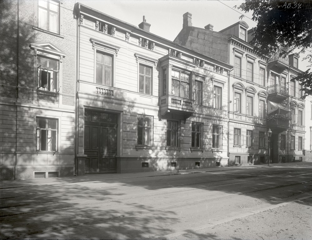 Fotografi av Trädgårdsgatan. I förgrunden syns själva gatan och dess spårvagnsspår. Uppe i högra hörnet syns delar av ett träd. Två hela byggnader syns på andra sidan gatan, samt delar av en byggnad till höger och en till vänster om dessa två. Byggnaden med adressen Trädgårdsgatan 19, som är placerad ungefär i mitten av bild, har en port till vänster samt ett burspråk i mitten på andra våningen. Byggnaden till höger har balkonger på våning 2, 3 och 4.