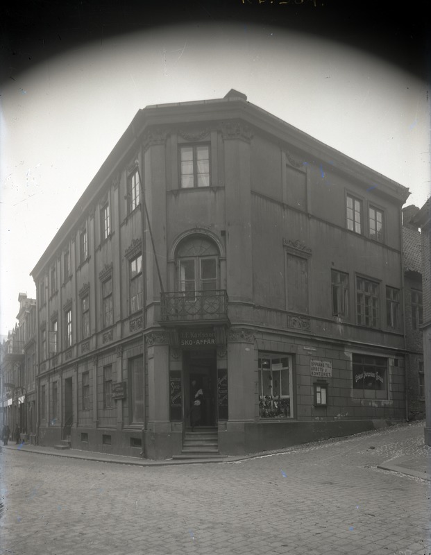 Fotografi av hörnhuset på Himmelriksgränden – Södra Storgatan. Fotografiet är taget åt nordost från Södra Storgatan. Byggnaden är i tre våningar och på bottenvåningen ligger en skoaffär. Butiksentrén ligger precis på hörnet. En kvinna och ett barn är på väg ut ur butiken. På båda sidor om entrén sitter reklamskyltar där det står ”Elektrisk skoreparationsverkstad” på den vänstra och ”Reparationer utföras elegant hållbart på kort tid” på den högra. Ovanför entrén hänger en skylt där det står ”O. F. Karlssons Sko-affär”. På fasaden på Södra Storgatan finns en skylt till där det står ”Helsingborgs elektriska sko-reparationsverkstad”. Till höger om entrén finns ett skyltfönster med skor. Bredvid, på fasaden, sitter en skylt med texten ”Uppgång till arbetskontoret” ovanför en anslagstavla. Ytterligare några hus skymtar åt norr på Södra Storgatan. Några personer står på trottoaren utanför ett av dem.