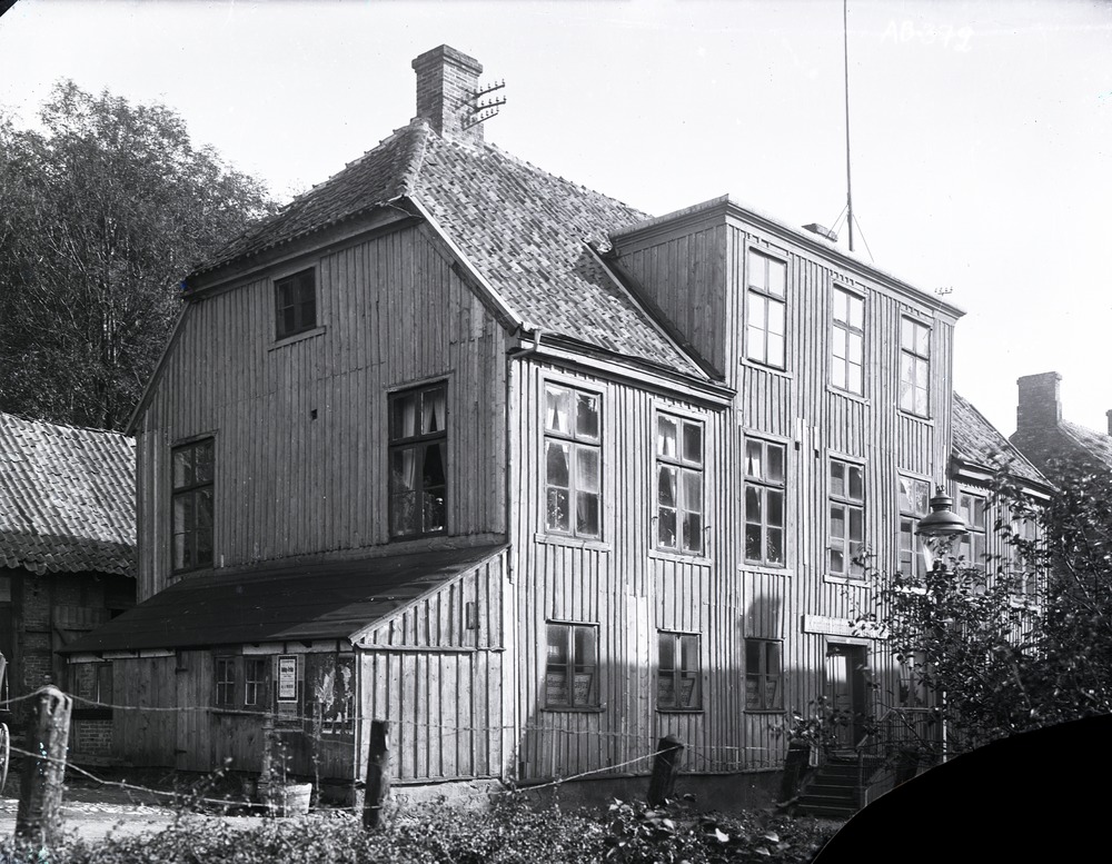 Fotografi av Tornerhjelmska huset taget åt sydost. I förgrunden syns ett enkelt staket och en del växtlighet. Byggnaden, klädd i träpanel och med en dubbeltrappa upp till entrédörren, är placerad mitt i bild. På dess norra gavel finns en tillbyggnad på bottenvåningen. Längst till vänster i bild skymtar en korsvirkesbyggnad bakom huvudbyggnaden. Bakom denna växer träd.