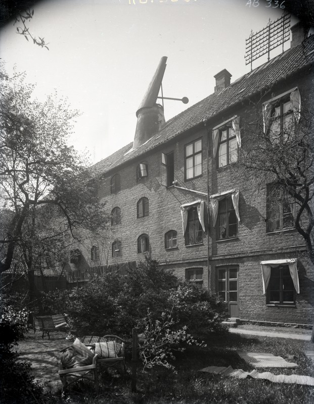 Fotografi av Konsul Olssons magasin – ett trevåningshus med magasin till vänster i bild och Konsul Olssons bostad till höger - fotograferat från husets trädgård. I förgrunden syns trädgården med gräsmatta, buskar, träd och trädgårdsmöbler. Några mattor ligger i gräset och på en bänk, troligen för att vädras.