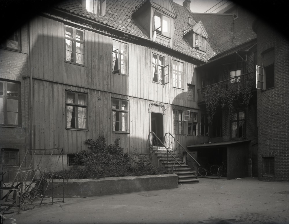 Fotografi av Gamlegård på Norra Storgatan, sett från innergården. Huset är här klätt i träpanel. Till vänster om trappan som leder upp till ingången en halv våning upp finns en upphöjd rabatt med bland annat någon form av klätterväxt. Mellan trappan och tegelbyggnaden till höger finns ett litet skjul med ett par parkerade cyklar. På tredje våningen finns en balkong varifrån klätterväxter hänger ner.