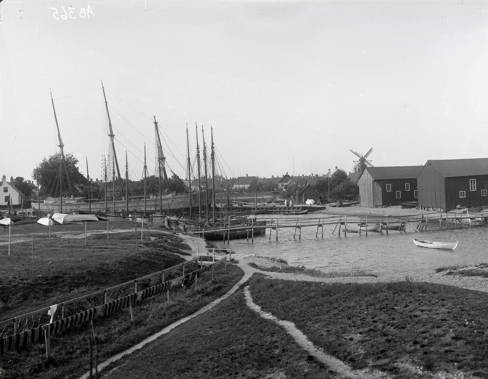 Fotografi av Råå hamn. I förgrunden, i mitten och åt vänster i bild, gräsbevuxen mark med flera smala grusgångar. Härifrån går en träbro över till andra sidan vattnet, åt höger i bild. På vänstra sidan ligger ett flertal fartyg och båtar förtöjda. Några mindre båtar ligger uppe på land. På andra sidan vattnet, ligger två träbyggnader bredvid varandra. I bakgrunden syns byggnader på Råå samt en mölla.