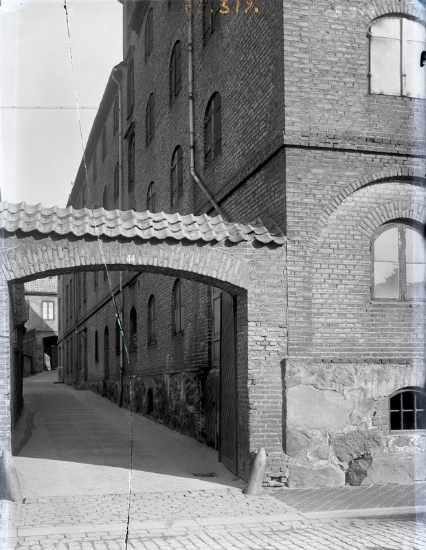 Fotografi av Konsul Olssons magasin på Kullagatan. I förgrunden syns lite av gatan och trottoaren. Till höger i bild står det fyra våningar höga magasinet, klätt i tegel och byggt på en stengrund. Till vänster om byggnaden finns en port, vars ram är av tegel. Porten står öppen in mot en smal väg som troligen leder till en innergård.