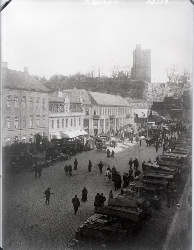 Avfotograferat fotografi av den allra sista torgdagen på Stortorget 1902. Fotografiet är taget några våningar upp i en av byggnaderna på torgets södra sida. Mycket folk och många handlare med sina vagnar syns på torget. I bakgrunden syns Kärnan och delar av Landborgen.