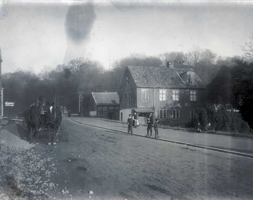 Fotografi av Hälsovägen och Jensenska trädgården. Bilden är troligen tagen under arbetet med att bredda Hälsovägen. Till vänster ligger högar med grus och sten på den grusbelagda gatan. Intill högarna står två hästar framför en vagn. En man står uppe på vagnen och ser ut att skyffla något ur den, troligtvis mer grus eller sten. Till höger om gatan löper en trottoar. På denna står, och sitter, ett antal pojkar och en kvinna är på väg uppåt Hälsovägen. Längre in i bild ligger ett korsvirkeshus i två våningar med ett litet korsvirkeshus bakom, uppåt mot backen. Framför huset ligger Jensenska trädgården. I bakgrunden ligger Landborgen, täckt av träd.
