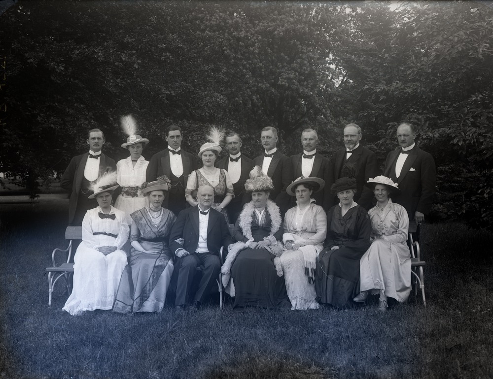 Grupporträtt av Christopher och Isabella Carlander med familj. Fotografiet har arrangerats utomhus i en park eller trädgård. Nio personer står på en rad och framför dem sitter sju personer på två bänkar. Christopher och Isabella sitter som nummer tre och fyra från vänster. Alla ser ut att vara finklädda.