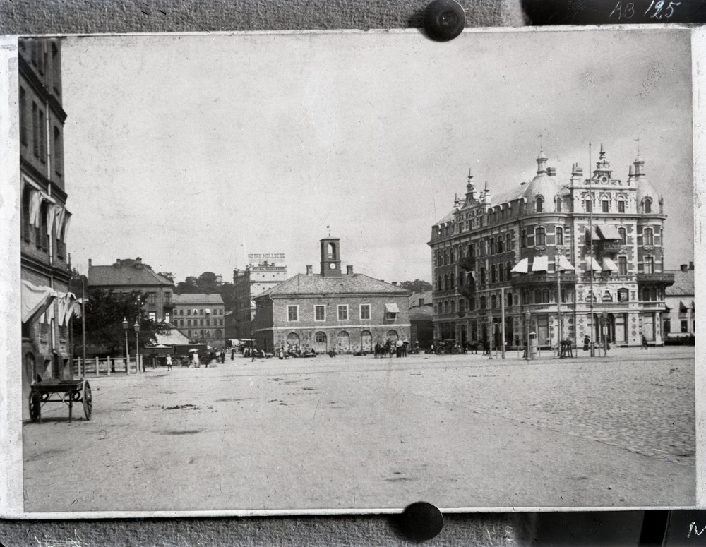 Avfotograferat fotografi taget från Hamntorgets norra sida mot Stortorget. I mitten av bilden syns det gamla rådhuset, till höger om det Centralpalatset. Framför rådhuset, och på Stortorget som skymtar där bakom, syns en hel del människor i rörelse.