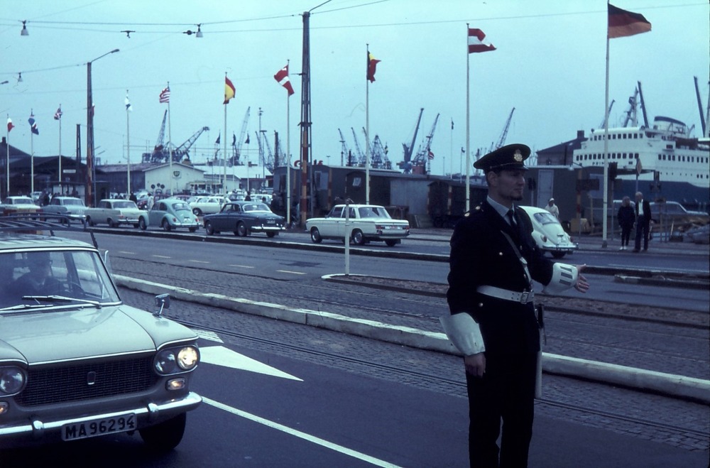 Fotografi taget i samband med högertrafikomläggningen 1967. På bilden syns den trafikerade Järnvägsgatan, med högertrafik. En polis står i förgrunden och tycks dirigera trafiken. I bakgrunden på bilden syns hamnen med kranar och fartyg.
