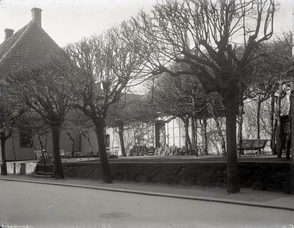 Fotografi av den terrasserade trädgården tillhörande Henckelska gården. Fotografiet är taget åt nordost från Norra Storgatan. Trädgården avgränsas av en låg stenmur längs med trottoaren. På trottoaren, och även på terrassen, står träd. Terrassen avgränsas i östlig riktning av en högre, putsad mur i vilken det finns två dörrar. Dessa leder in till en annan del av trädgården. Terrassen är grusad och på den står ett antal parkbänkar utspridda bland träden. I en nisch i den höga muren, ungefär i bildens mitt, står en skulptur i form av en kvinna. Framför skulpturen finns en rad med stenblock och framför dessa finns en låg fontän. Till vänster i bild syns huvudbyggnadens södra gavel.
