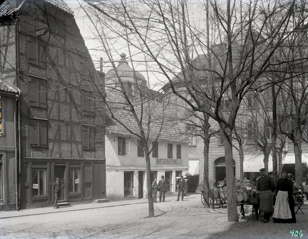 Fotografi av Skolgatan – Norra Kyrkogatan. Till vänster i bild, på Skolgatan, ligger ett korsvirkeshus i flera våningar. I bottenplan finns någon typ av affär. På trottoaren framför står en man, vänd mot kameran. Nästa hus, åt höger, längs gatan är hörnhuset Skolgatan – Norra Kyrkogatan där det, enligt skylten på fasaden, finns en matservering runt hörnet. På gatan framför står tre män som ser ut att prata med varandra. Två av dem tittar mot fotografen. Till höger i bild bedrivs det torghandel. Mellan träden framför Mariakyrkan (ej synlig i bild) står det ett antal uppställda bord med bland annat flätade korgar. Längst till höger står en man och en kvinna, troligen torghandlare, som båda tittar in i kameran.