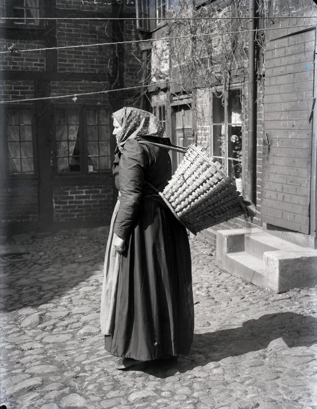 Fotografi av fiskförsäljerska på Råå. Kvinnan står i profil på en innergård. På ryggen bär hon en stor korg. Hon är klädd i klänning med förkläde och har en sjal över huvudet. I bakgrunden syns ett hörn av innergården och korsvirkeshusen som utgör delar av gården. Gårdsplanen är belagd med kullersten. Ovanför kvinna löper vad som ser ut som tre tvättlinor från bildens ena långsida till den andra.