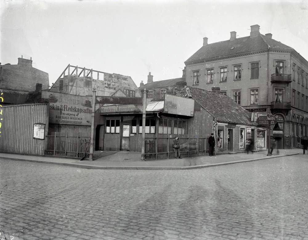 Fotografi av byggnader på ett hörn vid Stortorget. Fastigheten på hörnet är en tegelbyggnad med en utbyggnad i trä på gaveln. Ett staket och ett plank avgränsar tomten ut mot trottoaren. På planket sitter en anslagstavla. På gaveln ovanför dörren till byggnaden, på vilken det står skrivet ”KONTOR”, finns en skylt där det står ”N. S. Rycéns Maskin- & Agenturaffär”. Det finns ytterligare två reklamskyltar på byggnaden. Den ena gör även den reklam för Rycéns verksamhet. Vad det står på den andra går inte att utläsa. Vid staketet står en pojke och en man. Resten av tegelbyggnaden utgörs av en cigarrhandel, en verksamhet vars skylt ej går att tyda och en guldsmed. En skylt hänger ut över trottoaren där det står ”AXEL LA…..ON. GULDSMED.”. Nästa byggnad, åt höger, är ett flervåningshus. I källaren, på hörnet, ligger Frits Larsens café. Ytterligare några personer rör sig på trottoaren och gatan framför byggnaderna. I bakgrunden, åt vänster i bild, skymtar tak och gavlar från andra byggnader.