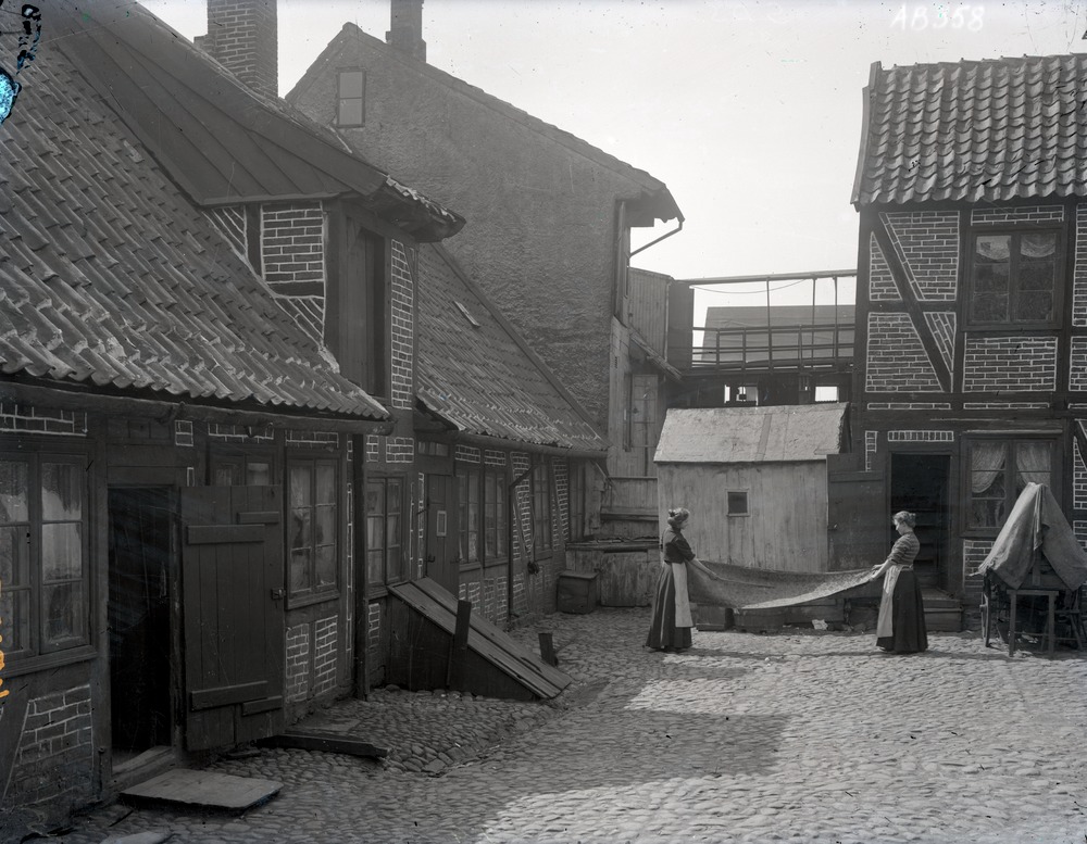 Fotografi av gårdsinteriör på Långvinkelsgatan. Ludvig Borg startade ett tvätteri och färgeri i huset 1843. Vid fotograferingstillfället hade verksamheten flyttat till Hälsovägen. Till vänster i bild ligger ett korsvirkeshus i 1,5-plan. Huset är hopbyggt med ytterligare ett hus inåt i bild. Till höger ligger ett annat korsvirkeshus i två våningar. På gårdsplanen framför husen står två kvinnor och håller i varsin ände av ett tygstycke. Kvinnan till vänster i bild har en pinne som hon ser ut att slå på tyget med, troligtvis i syfte att vädra det.