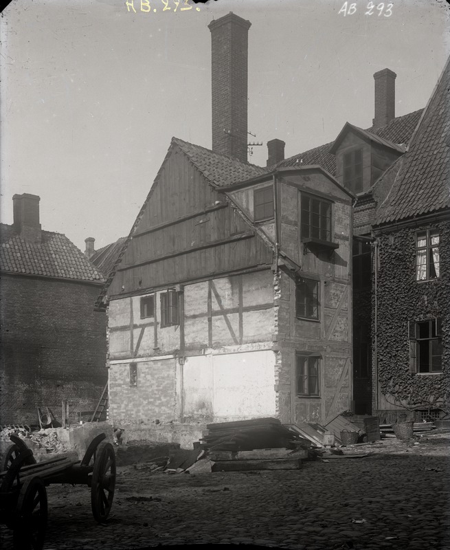 Fotografi av Gamlegårdens innergård under ombyggnation. I förgrunden syns den kullerstensbelagda innergården. En vagn syns i bildens vänstra kant. Delar av ett korsvirkeshus har rivits och det ligger en del bråte där byggnaden tidigare stått. Till höger om korsvirkesbyggnaden skymtar en flervåningsbyggnad täckt av murgröna. Till vänster syns delar av andra flervåningshus.
