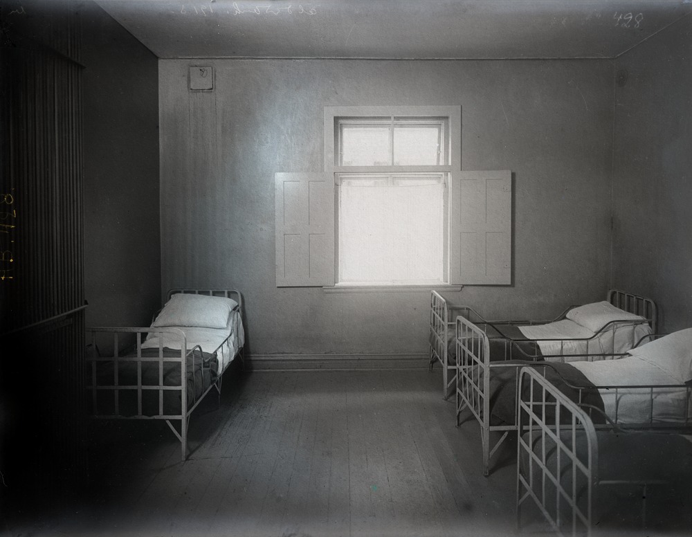 Fotografi av en sovsal på Ålderdoms- och sjukhemmet Bergalid. Till vänster står en säng med huvudänden mot ytterväggen. På ytterväggen finns ett fönster med öppna fönsterluckor. Längs med väggen till höger i bild står tre sängar med huvudändarna mot väggen.
