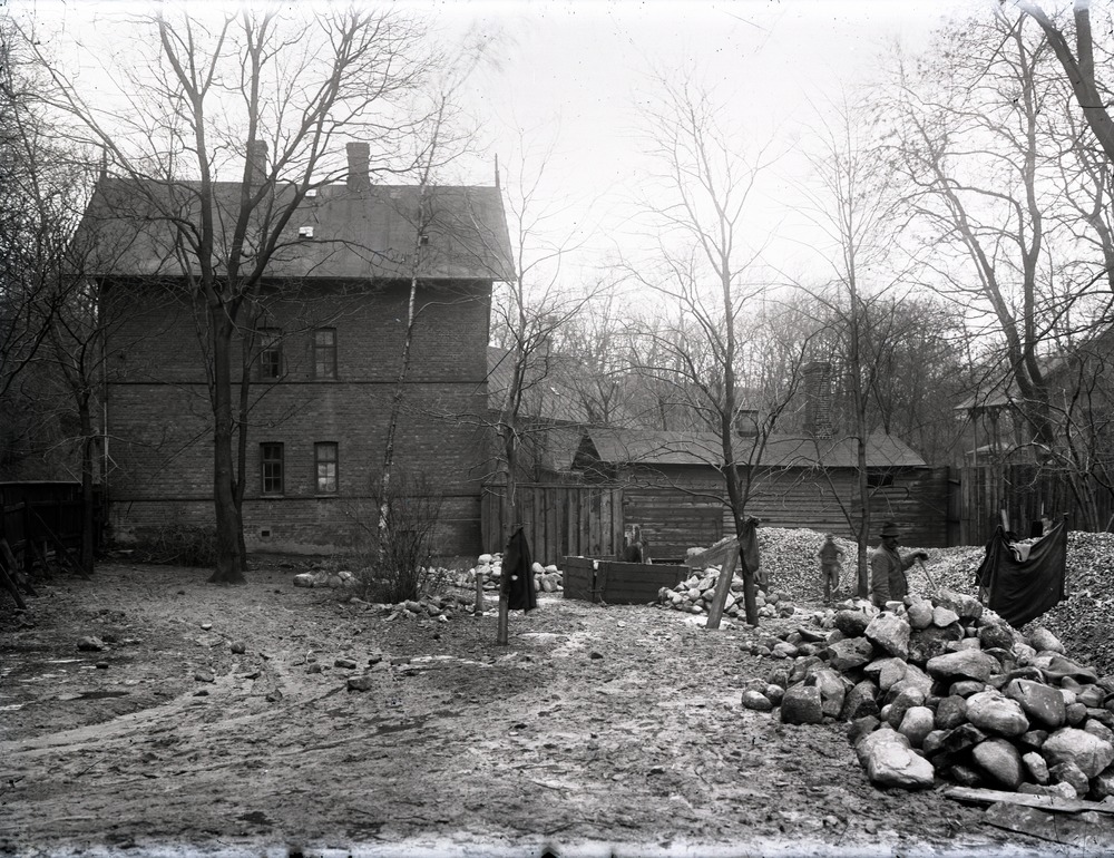 Fotografi av en bakgård vid Hälsan. Tre män står vid en lång vall av småsten längst till höger i bild. Där finns också några högar med större stenar. Mannen närmst fotografen tittar in i kameran. Exakt vad männen arbetar med är oklart. Två jackor har hängts upp i två av de nakna träden på gårdsplanen. Marken ser ut att vara mycket lerig. I bakgrunden syns flera byggnader, både enplans- och flervåningshus.