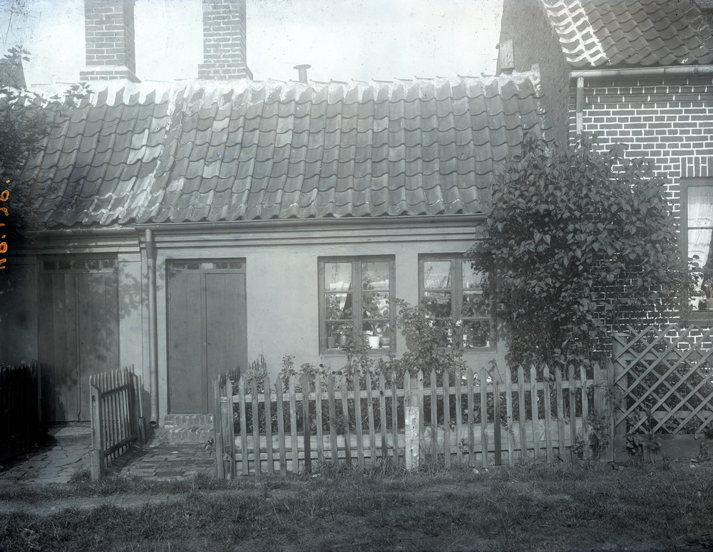 Fotografi av ett hus längs Södergatan. I förgrunden syns en bit gräsmatta och sedan låga staket som avgränsar de små trädgårdarna framför husen. Till vänster syns delar av ett enplanshus som är ihopbyggt med nästa enplashus. Det huset är i sin tur ihopbyggt med huset längst till höger. Detta är ett 1,5-planshus i tegel.