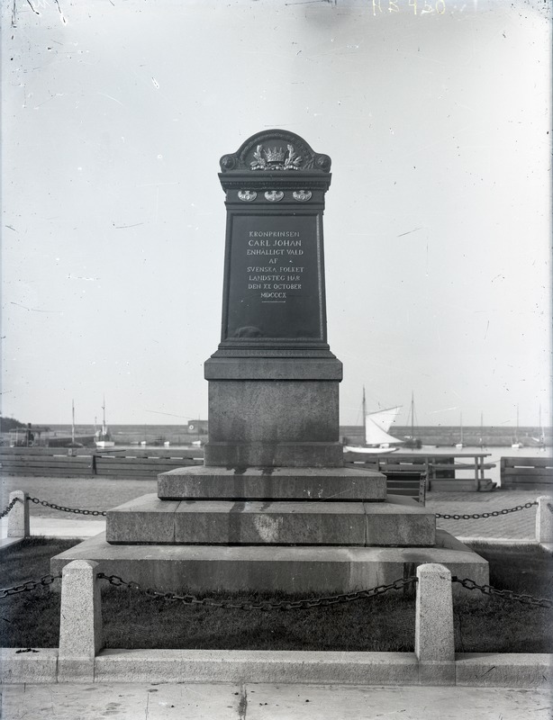 Fotografi av Bernadottemonumentet, minnessten över Carl XIV Johans landstigning i Helsingborg 1810. I bakgrunden syns delar av hamnen med en del förtöjda segelbåtar.