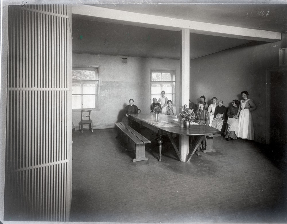 Avfotograferat fotografi av ett rum på Ålderdoms- och sjukhemmet Bergalid. I hörnet mittemot fotografen sitter ett antal kvinnor längs väggarna. Två av dem, båda klädda i sjukvårdsklädsel, står upp. En av de sittande kvinnorna är också sjukvårdsklädd. Två kvinnor sitter vid långbordet som står en bit in i rummet. Den ena på långsidan och den andra på den bortre kortsidan, sett från fotografens position. Långbordet är byggt runt en pelare och det finns tillhörande långbänkar på dess långsidor. På väggen längst in i bild finns två fönster.