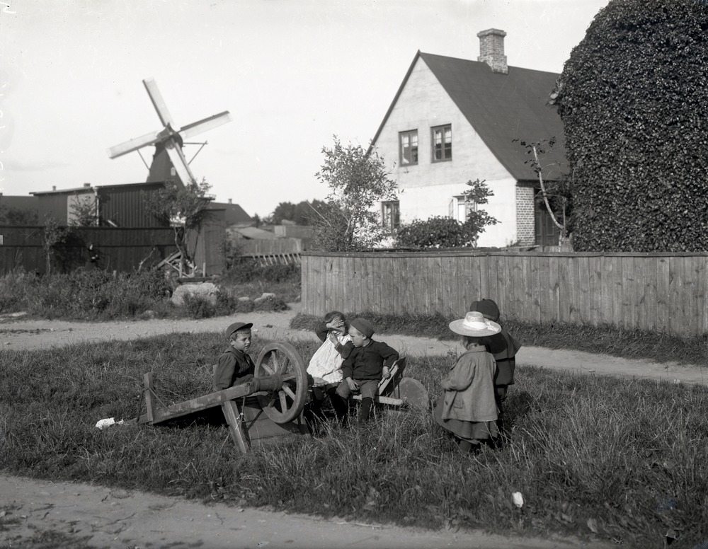 Fotografi av barn på Råå. Mitt i bild sitter tre barn på en kärra. Framför dem ligger en annan kärra upp och ner i gräset. Till höger om dem står ytterligare två barn vända mot de andra tre och med ryggarna mot fotografen. I bakgrunden ligger ett hus som man ser den ena gaveln på. Ett lågt plank avgränsar trädgården åt höger i bild. Bakom planket växer några olika buskar. Där planket tar slut, åt vänster, ligger en infart till tomten. Vidare åt vänster ligger ytterligare en del av tomten, denna är dock inte inhägnad. Fler byggnader syns i bakgrunden på bildens vänstra sida, bland annat en mölla.