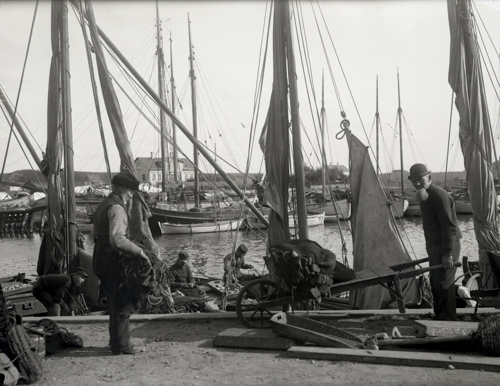 Fotografi av fiskare i Råå hamn. I förgrunden ligger kajen. Där står två män. Den ena, till höger i bild, håller i handtagen till en kärra och tittar mot fotografen. Mannen till vänster håller i vad som ser ut som ett hoprullat fiskenät. Nedanför kajen, i hamnbassängen, ligger fiskebåtar förtöjda. I dessa sitter tre män och arbetar. Fler båtar syns längs kajen längre in i bild. I bakgrunden syns några hus och ett svagt böljande landskap.