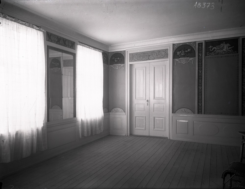 Fotografi av salsinteriör på andra våningen i Tornerhjelmska huset. Skira gardiner hänger för två fönster till vänster i bild. Mellan dem hänger en spegel. På väggen rakt fram finns en dubbeldörr. På väggarna finns en låg panel. Ovanför är väggarna tapetserade med en rikt ornamenterad tapet. En stol och ett bord skymtar längst till höger i bild. I övrigt är rummet tomt på möbler.