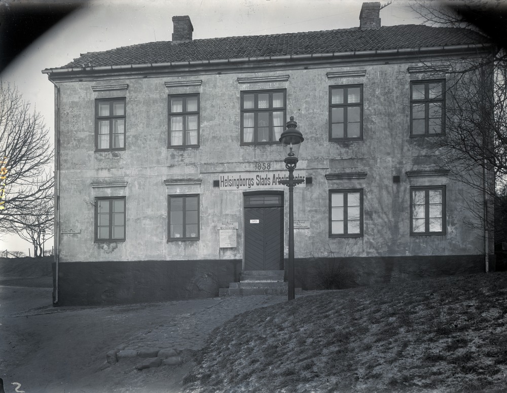 Fotografi av tvåvåningsbyggnaden som varit stadens första lasarett och som vid fotograferingstillfället inrymde Helsingborgs Stads Arbetskontor. I förgrunden, till höger, syns en väg eller gångväg samt en stenlagd gång i anslutning till byggnaden. Mellan gången och gräsmattan till höger står en gatlykta. På båda sidor byggnaden finns ett flertal träd.