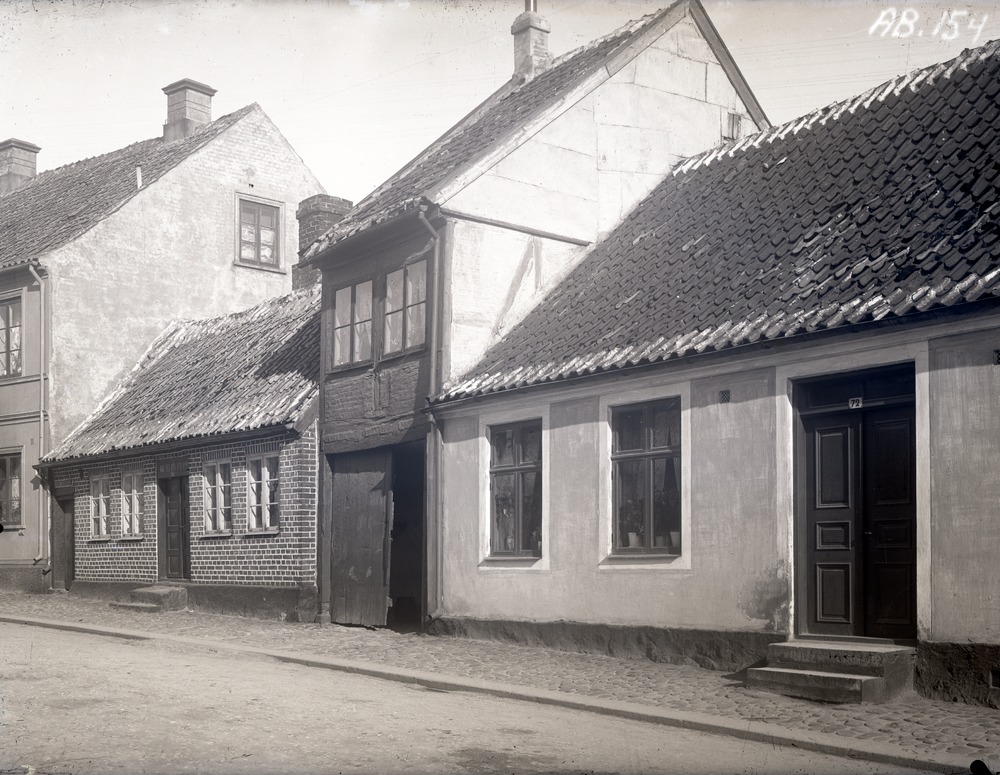 Fotografi av byggnader längs Långvinkelsgatan. I förgrunden syns den grusade gatan med kullerstensbelagd trottoar. Längst till vänster i bild syns delar av ett tvåplanshus. Till höger om det ligger ett teglat enplanshus. Nästa hus är ett smalt tvåplanshus med en port i botten. Sista huset i bild, alltså längst till höger, är ett putsat enplanshus.