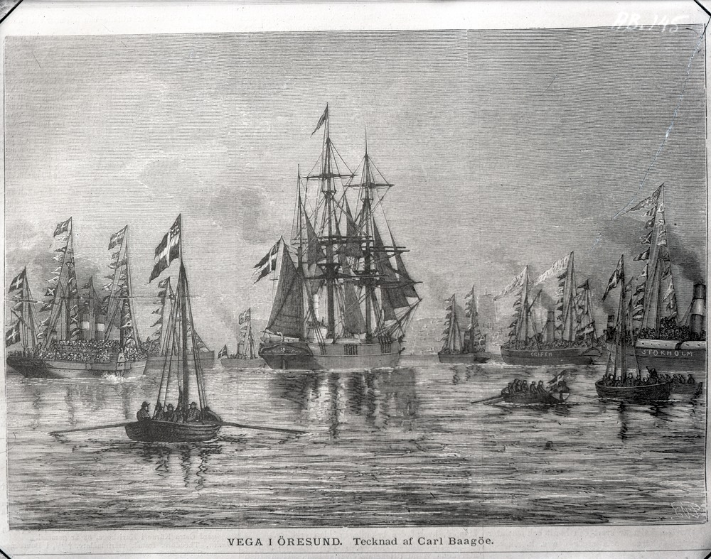 Avfotograferat tryck, troligen publicerat i någon form av tidsskrift eller tidning. Originalet är gjort av Carl Baagøe. Bilden visar en eskader i Sundet som hyllar "Vega", ett fartyg som efter sin världsomsegling anlöper Helsingborg den 15 april 1880.