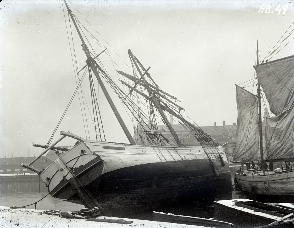 Fotografi av två segelfartyg i Helsingborgs hamn efter julstormen 1902. Fartyget i mitten av bilden har kantrat. Det mindre fartyget till vänster har seglen uppe. På kajen, som delvis syns i förgrunden, ligger det snö. I bakgrunden syns stadsbebyggelse.
