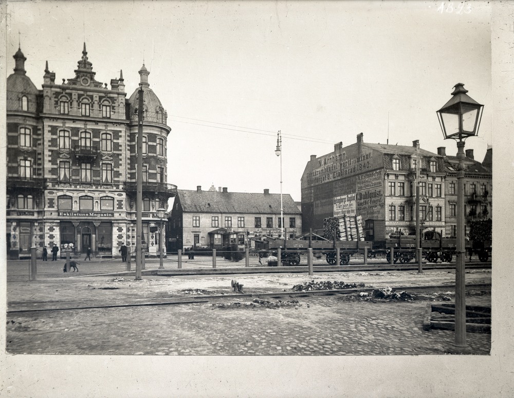 Fotografi av Järnvägsgatan. I förgrunden syns järnvägsspår och en lyktstolpe. På ett av spåren står tågvagnar. Bakom dessa, till vänster i bild, ligger Centralpalatset. Till höger om det ligger ett tvåvåningshus och därefter ett fyrvåningshus med reklam målad på byggnadens vänstra gavel. Här görs bland annat reklam för Helsingborgs dagblad, kungliga hovfotografen C. Dahlquist och N. Arnhamns järnhandel. Ytterligare en byggnad är synlig till höger om denna.
