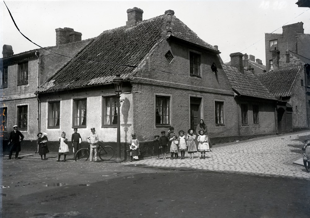 Fotografi taget åt nordost i gatukorsningen Möllegränden – Södra Strandgatan. I förgrunden löper Södra Strandgatan. I gathörnet står en skara barn i olika åldrar. En pojke håller i en cykel. En flicka håller ett mindre barn i famnen. Längst till vänster i bild, på Södra Strandgatan, står en man med käpp och vad som ser ut som en studentmössa på huvudet. Bakom den klunga av barn som står på Möllegränden står en kvinna med huckle. Ett flertal sammanbyggda hus ligger bakom dem längs de båda gatorna. På andra sidan Möllegränden, längst till höger i bild, står en ensam pojke.