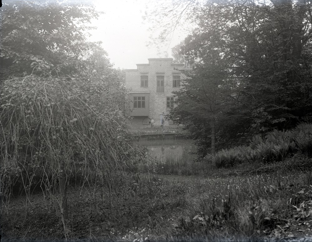 Fotografi som visar en del av Hälsans gjuteri. Byggnaden, placerad i mitten av bilden, var förvaltningsbyggnaden samt överingenjörens bostad. Intill byggnaden står en man vänd mot fotografen. I förgrunden syns en damm och träd, buskar och annan växtlighet.
