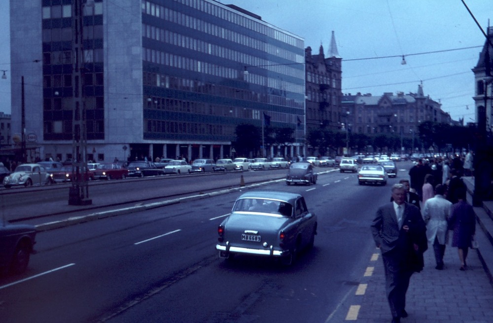 Fotografi taget i samband med högertrafikomläggningen 1967. På bilden syns den trafikerade Drottninggatan i förgrunden, med högertrafik. I bakgrunden på bilden syns stadsbebyggelse, med dåvarande stadshuset. Där bakom skymtar också Sundstorget.