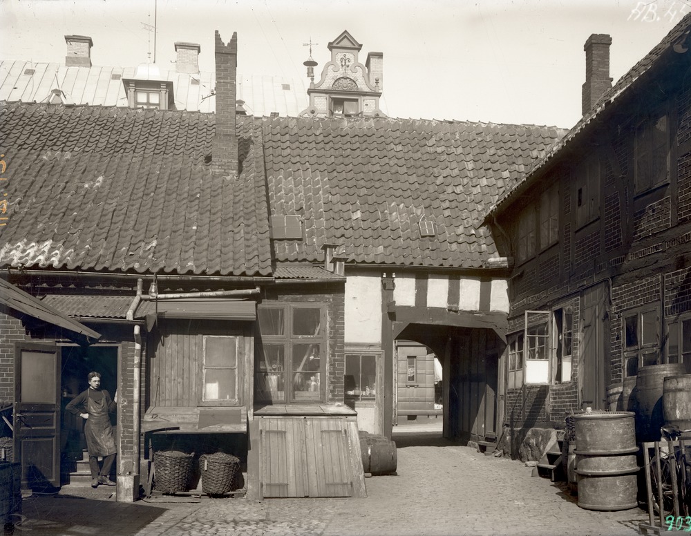 Fotografi av innergården Södra Storgatan 24. I förgrunden stenlagd gårdsplan där flertalet tunnor och korgar av olika slag finns här och var. En man med förkläde står i en dörröppning och tittar in i kameran. Runt innergården finns enplans- och tvåplansbyggnader. Portgången ut mot gatan är öppen och byggnaderna på andra sidan gatan syns därigenom och ovanför hustaken.
