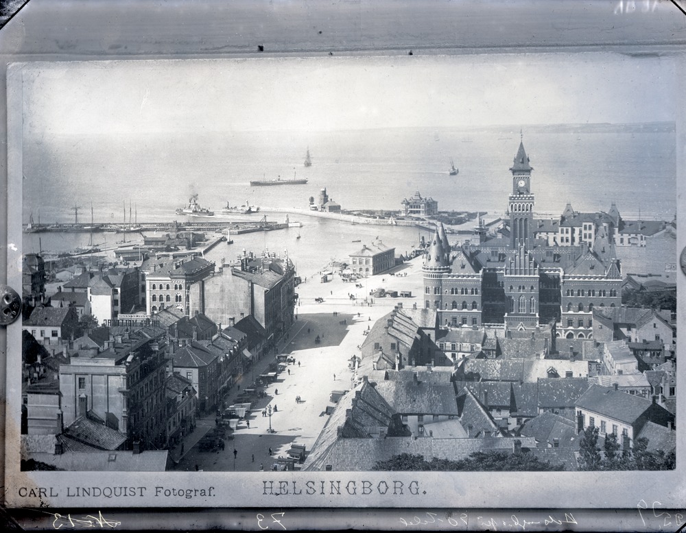 Avfotograferat fotografi. Originalet är taget av fotograf Carl Lindquist. Fotografiet visar utsikten från Landborg utöver Helsingborgs stadskärna och hamnen. I mitten av bilden syns Stortorget, Rådhuset och Tullhuset. I, och utanför hamnen, syns ett antal fartyg. På andra sidan sundet skymtas Danmark.