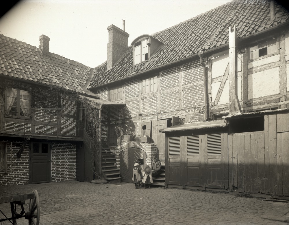 Fotografi av innergården på Norra Strandgatan 16. I förgrunden syns delar av gårdsplanen. En vagn skymtar i vänster hörn. Två korsvirkeshus är ihopbyggda med varandra. På en trappa till huset på bildens högra sida sitter en äldre man. Framför honom står två små flickor. Mannen tittar in i kameran. Till höger om dem finns gårdens toalettbyggnad.