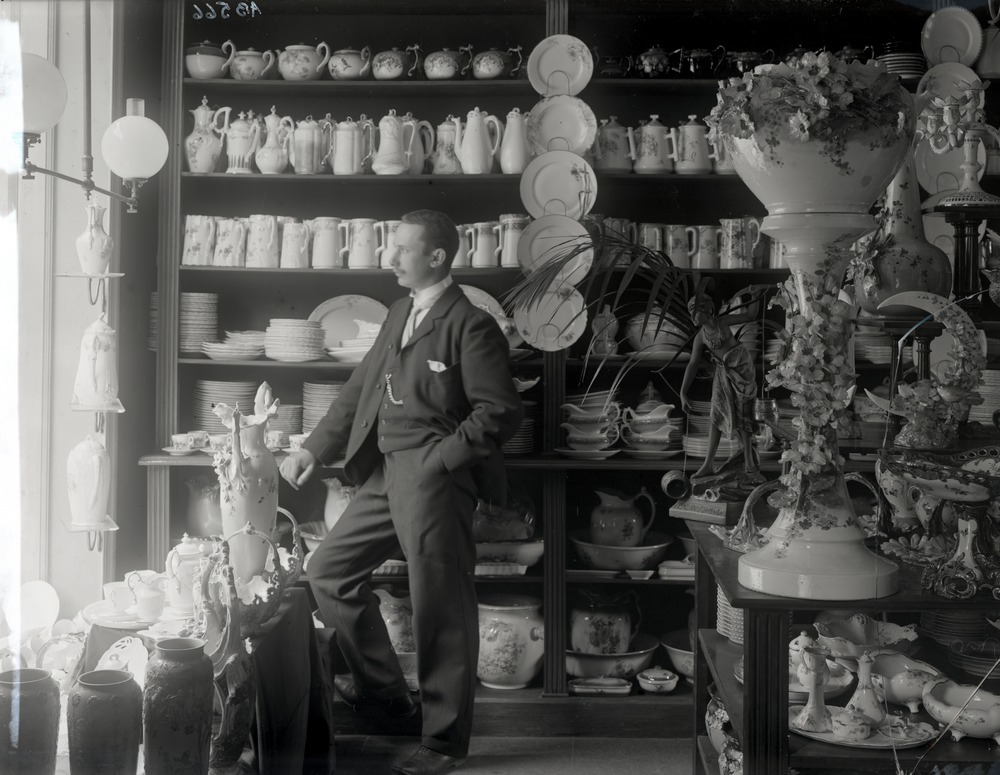 Lars Holms glas- och porslinsaffär. Norra Storgatan 5. Interiör med Lars Holm.