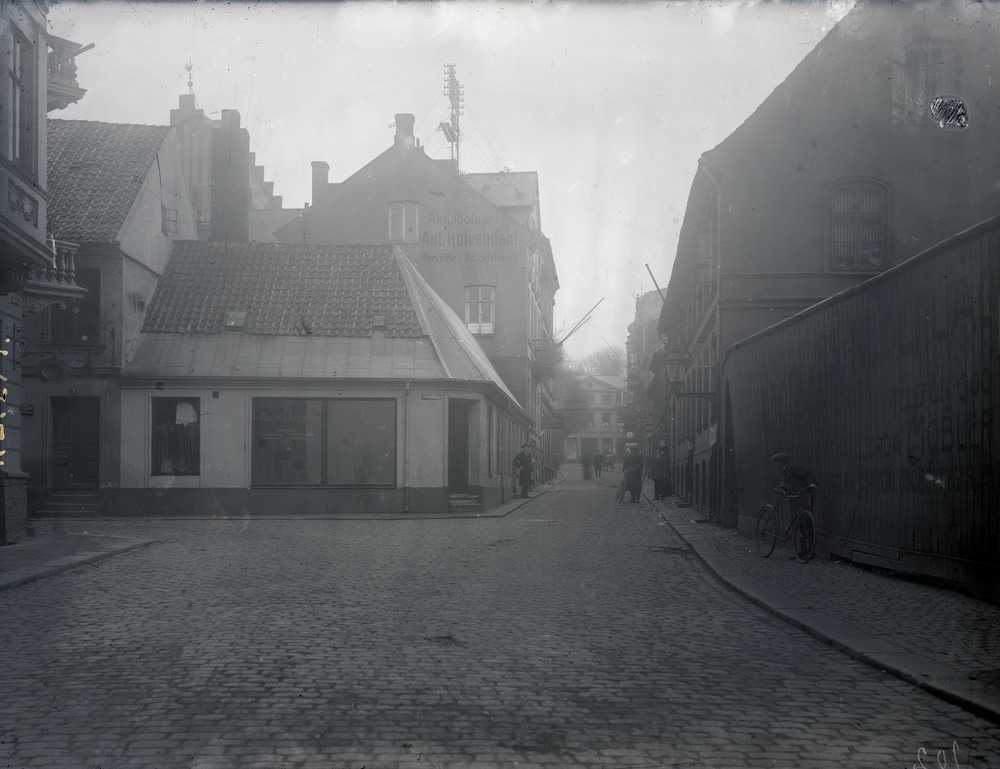 Fotografi av korsningen Lilla Strandgatan – Södra Kyrkogatan. Fotografiet är taget åt öster från Södra Kyrkogatan. På bildens vänstra sida syns några byggnader på Lilla Strandgatan. I hörnhusets skyltfönster står det ”FOTOGRAFERING” på glaset. På gaveln på nästa hus, nu på Södra Kyrkogata, står det målat ”Aktiebolaget Ant. Hofvendahl. Partiaffär i Kolonialvaror.”. På bildens högra sida finns det i förgrunden ett plank. En pojke med en cykel står på trottoaren intill planket. Byggnaderna längs Södra Kyrkogatans södra sida skymtar hela vägen upp till Södra Storgatan. Flertalet butiksskyltar hänger ut från fasaderna på båda sidor gatan. På gatan rör sig ett antal personer.
