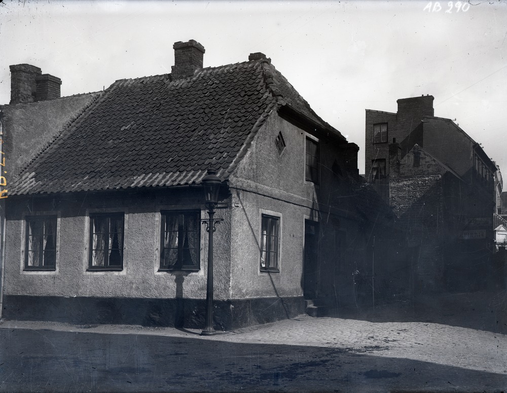 Fotografi av korsningen Södra Strandgatan – Möllegränden. Fotografiet är taget åt nordöst. I hörnet står en gatlykta. Längs Möllegrändens norra sida syns enplans- och flervåningshus.