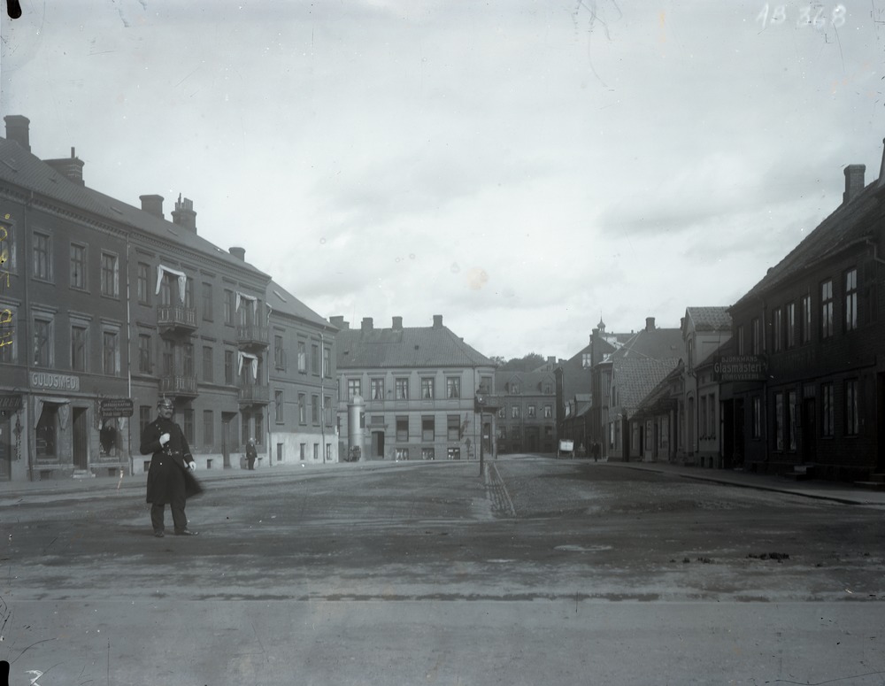 Fotografi av Gasverksgatan. I bildens mitt en bred gata som är avgränsad med några rader gatsten i mitten. Där står också en lyktstolpe. Till vänster i bild står en uniformerad man, möjligen polis. I flervåningshuset bakom honom finns det, enligt skyltarna på fasaden, en guldsmed, en tobakshandel och ett skrädderi. Ytterligare två byggnader ligger på denna sida innan gatan korsas av Carl Krooks gata. En man står på trottoaren framför ett av husen. På gatans motsatta sida ligger bland annat Björkmans Glasmästeri. En man står på hörnet vid Carl Krooks gata. En bit längre in i bild står en man bredvid en vagn. I bakgrunden syns byggnader vidare på Gasverksgatan, Carl Krooks gata samt Södergatan.